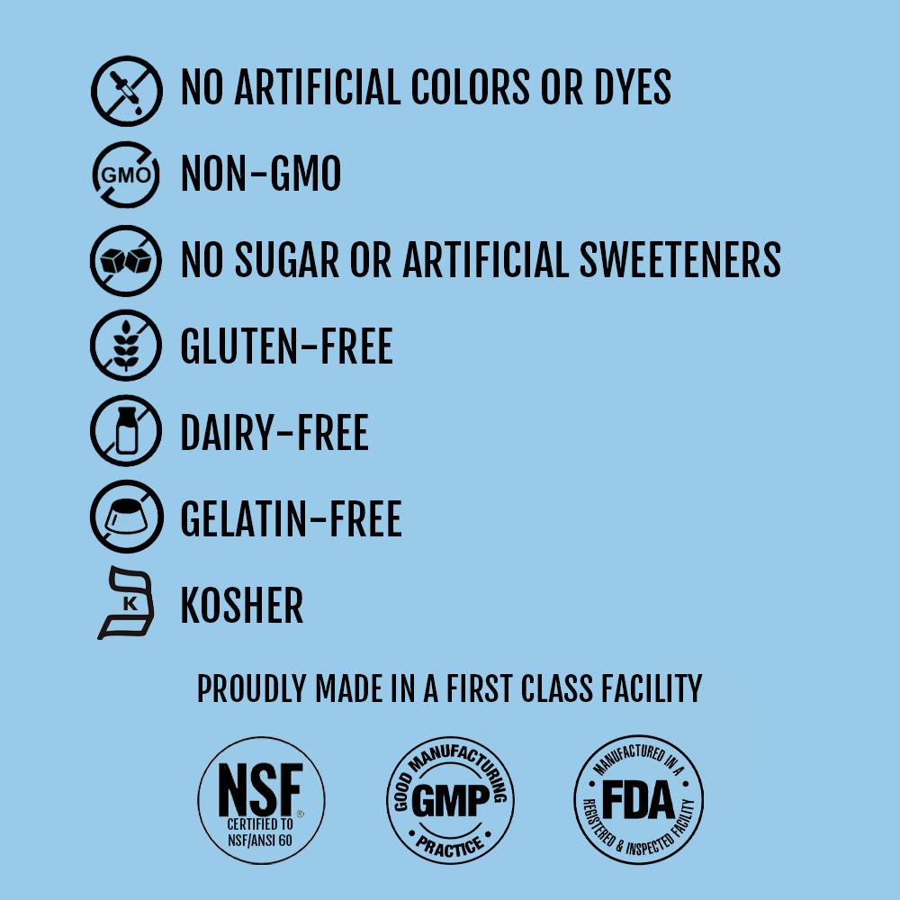 Non-GMO, gluten-free, dairy-free, and Kosher—no color dyes, sugar or artificial sweeteners.