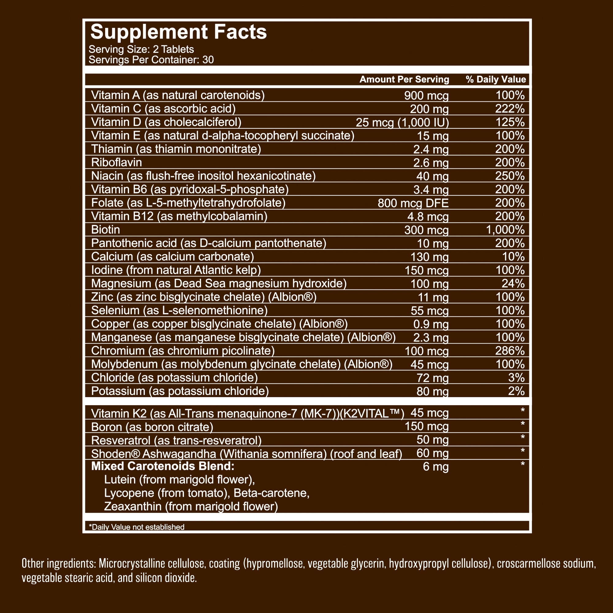 Includes special nutrients like lutein and zeaxanthin for eye health, ashwagandha to help reduce stress, and resveratrol to support longevity.